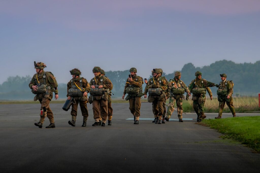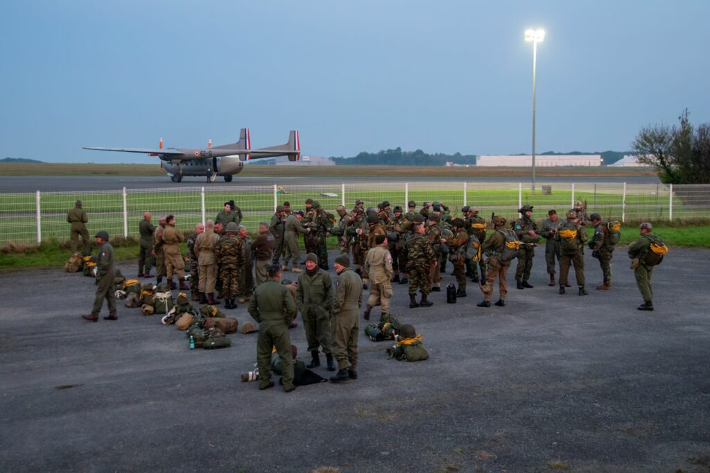 À Dinard, tôt le matin, l’aéroport s’anime. Les parachutistes de l’association Airborn Center apparaissent en tenue de la Seconde Guerre mondiale. Casques, sacs, treillis : tout est authentique. Leur arrivée attire immédiatement les regards.