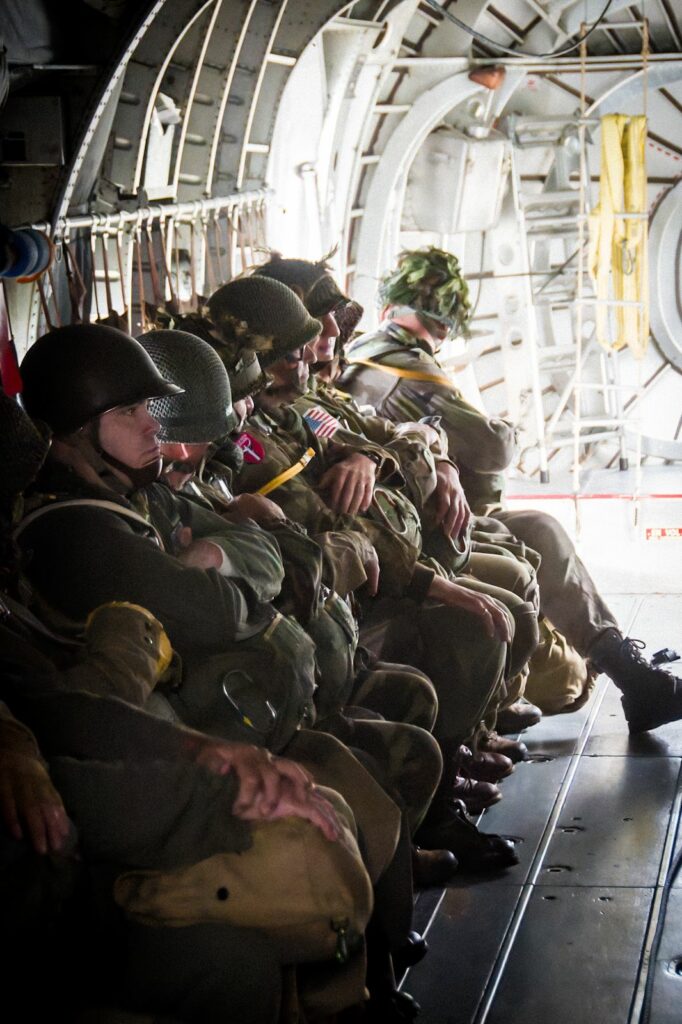 Le Noratlas prend de l’altitude et met le cap sur le Mont Saint-Michel. Dans la carlingue, chacun attend son heure. Les gestes sont mécaniques : vérifier les sangles, resserrer le casque, contrôler l’équipement.