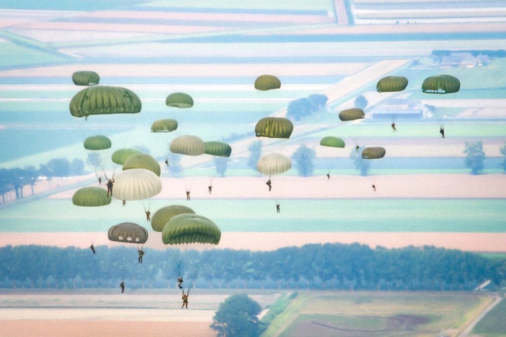Les voiles claquent et se déploient dans le ciel normand. En contrebas, l’abbaye millénaire devient décor. La scène impressionne. Plus qu’un simple saut, ce largage représente un hommage. Aux anciens, aux traditions, à l’histoire militaire. Chaque saut est une mémoire vivante.