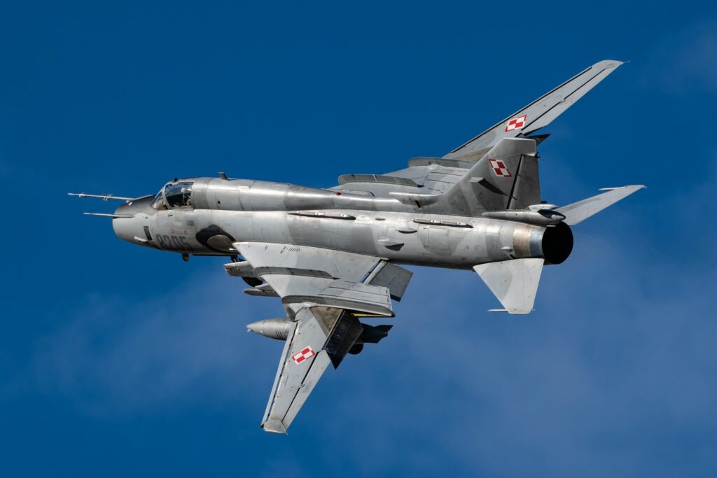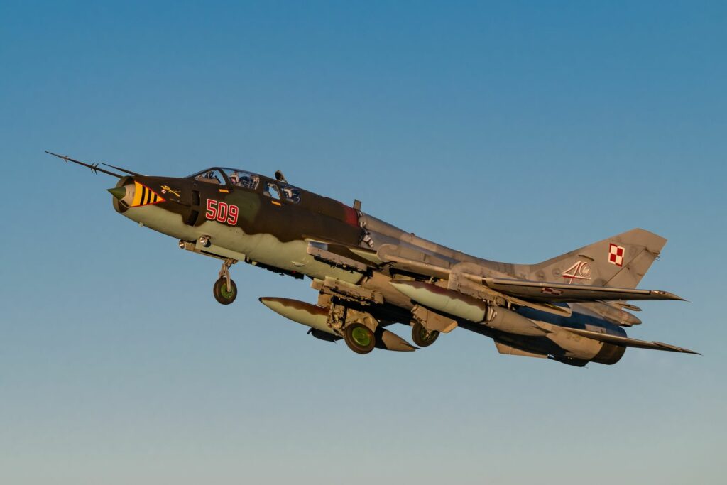 Les premiers Su-22 ont été livrés à la Pologne en 1984. Au total, 120 appareils ont été acquis, comprenant 90 monoplaces Su-22M4K et 20 biplaces d’entraînement Su-22UM3K, destinés à remplacer les anciens chasseurs-bombardiers Su-7 et les MiG-17. Pour la Pologne, membre du Pacte de Varsovie, l’acquisition de ces aéronefs de quatrième génération représentait une modernisation significative et un renforcement de sa capacité d’attaque au sol. Dans la doctrine militaire de l’époque, les Su-22 étaient des plateformes essentielles, capables de mener des frappes tactiques, y compris avec des armements nucléaires, et d’assurer un appui aérien rapproché pour les forces terrestres.