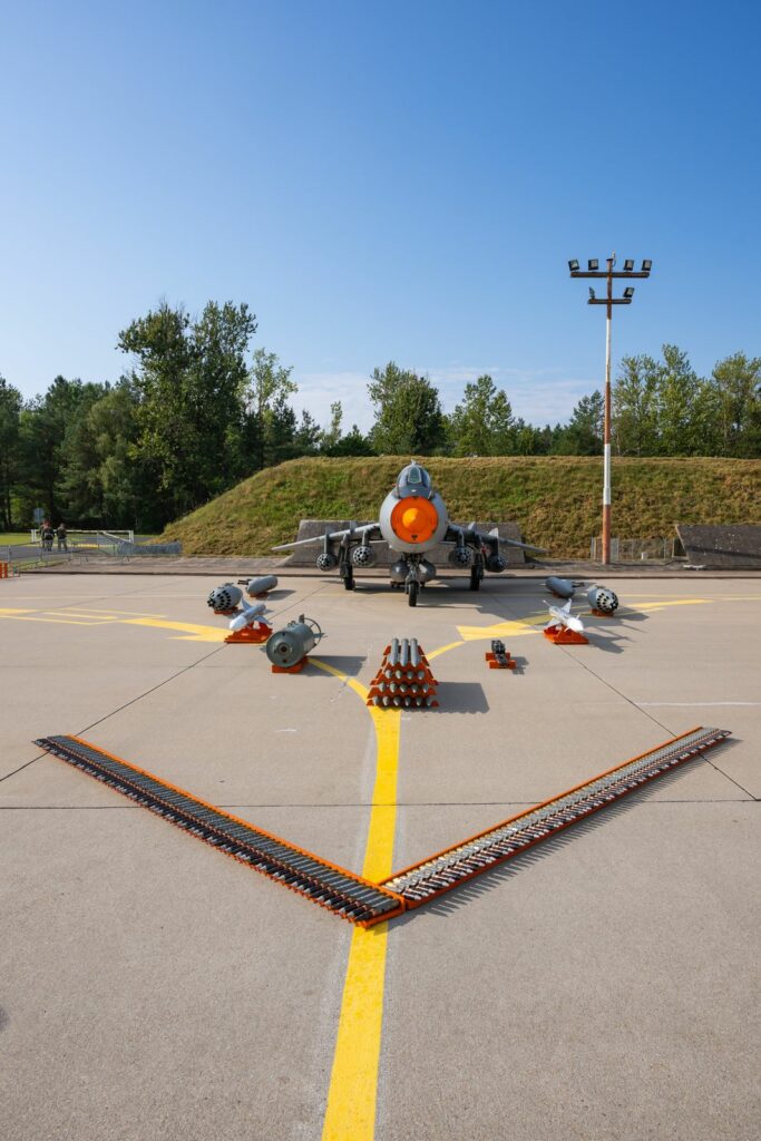 A cette occasion, deux appareils étaient présentés au parking statique. L’un y exposait tout l’arsenal possible que pouvait emporter le Su-22. Une grande panoplie de bombes, pods roquettes, réservoirs, ainsi que les pods canons SPPU-22 (Samolyatnaya Podvizhnaya Pushechnuaya Ustanovka, soit littéralement Support de canon mobile pour avion) sont mis en avant. Ces derniers sont équipés d’un autocanon bitube GSh-23L de 23mm dont les fûts peuvent être orientés de 30 degrés vers le bas. Cela permet à l’avion de conserver une assiette horizontale tout en attaquant ses cibles. Ils ont également l’inhabituelle capacité de pouvoir être montés tirant vers l’avant ou vers l’arrière ! Le Sukhoi-22 avait un configuration pour le moins exotique avec la moitié des pods tirant vers l’avant et l’autre moitié tirant vers l’arrière ! Le deuxième appareil offrait la possibilité de monter à bord pour y découvrir le cockpit.