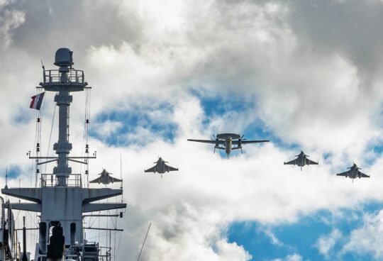 2 NH-90 se présent devant nous. L’un d’entre eux arbore une tenue d’un gris foncé qui attire notre attention. Et en effet, ce n’est pas un NH-90 comme un autre. Il arbore une cocarde italienne. De fait, cette année, un NH90 italien défilera au-dessus des Champs Elysées pour célébrer le travail commun en Méditerranée.