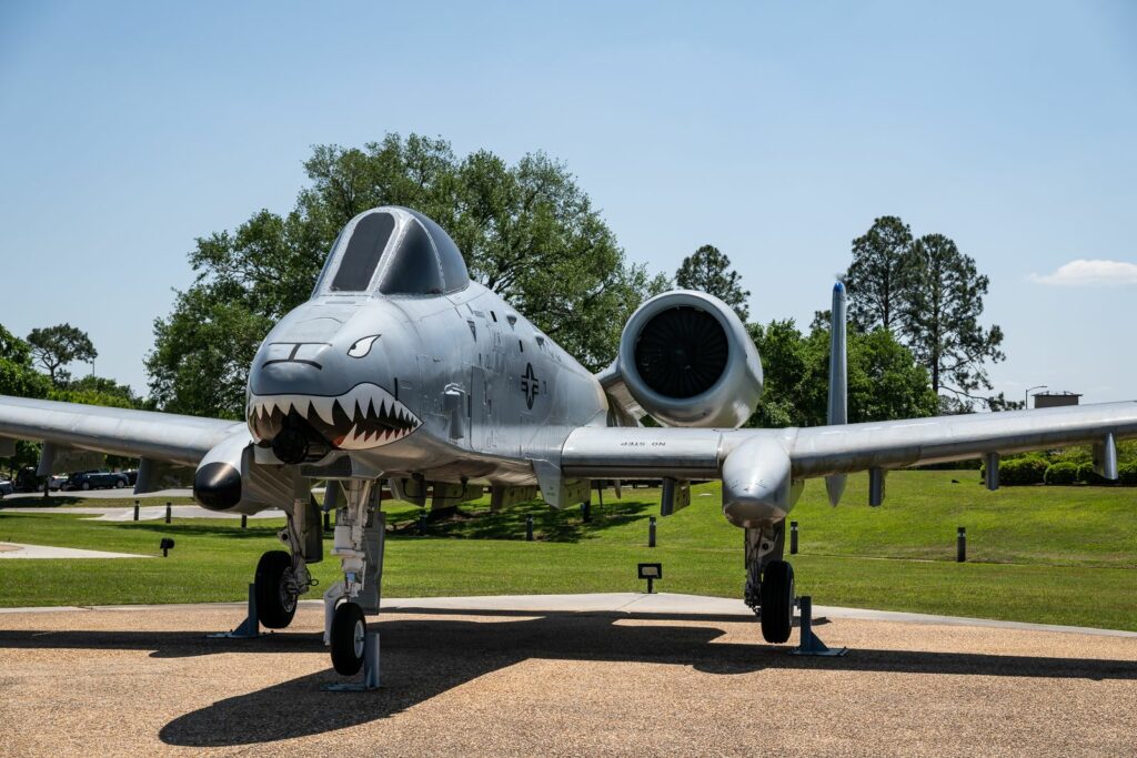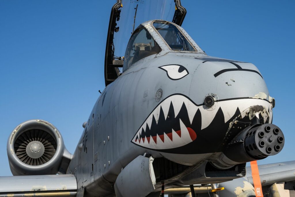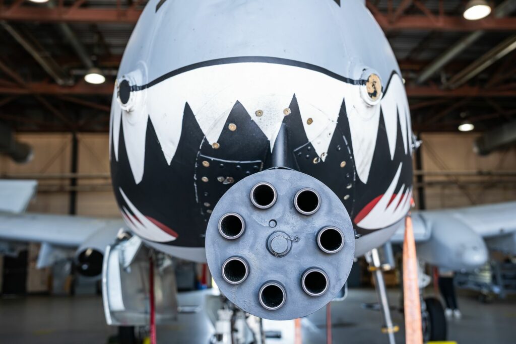 Le A-10 a été conçu et construit autour de son armement principal : le canon automatique de 30 mm GAU-8 Avenger. Ce canon de type “Gatling” (rotatif à haute cadence de tir) peut tirer jusqu’à 3 900 projectiles à la minute (soit 65 obus par seconde) !! Le bruit perçu au sol du GAU/8, très caractéristique et puissant, a un effet psychologique non négligeable tant sur les troupes alliées que sur les ennemis. Le soutien venant du ciel pour les uns, la peur pour les autres. (Note personnelle: au cours de la visite, j’ai pu entendre le fameux “BRRRRRTTTT” à plus de 6 kilomètres de distance! Un bruit reconnaissable entre mille). La force de recul du GAU-8 est de 45 kN, ce qui est légèrement supérieur à la poussée de l’un de ses deux propulseurs TF34, qui est de 40,6 kN chacun. Cette force de recul est tellement importante qu’en pratique, l’utilisation du canon ralentit l’avion de quelques km/h!