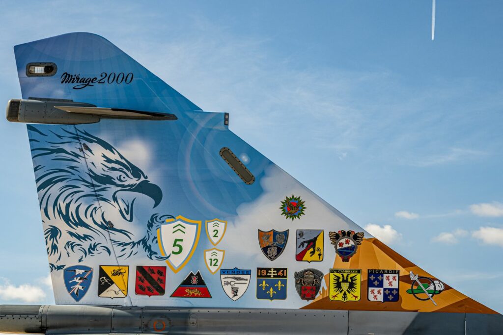 Les 5 variantes du Mirage 2000 étaient alignées sur le tarmac avec leur armement et avec des dérives décorées reprenant les armoiries des escadrilles où ils furent en service.