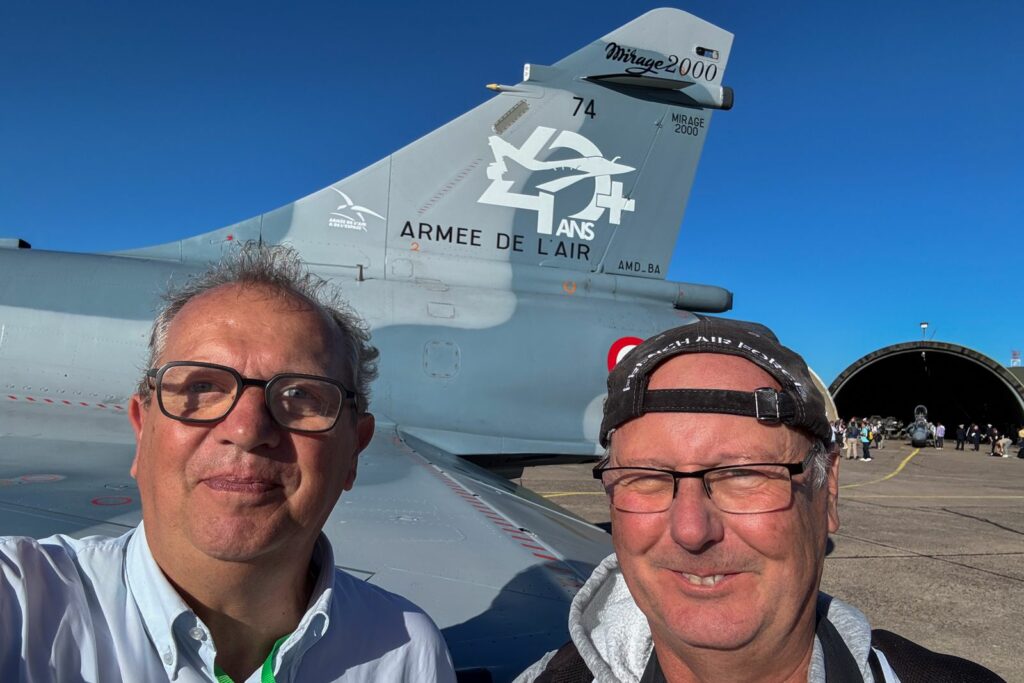 Situé à 100 m de la piste, nous avons pu assister au décollage de deux patrouilles de « Mirage 2000-5 » du 1/2 Cigognes, dont celui du Commandant d’escadron à la dérive ornée des trois cigognes de tradition, celle de la SPA3 de Guynemer, la SPA 103 de Fonck et la cigogne dite japonaise de la SPA73, nouvelle venue en 2024.