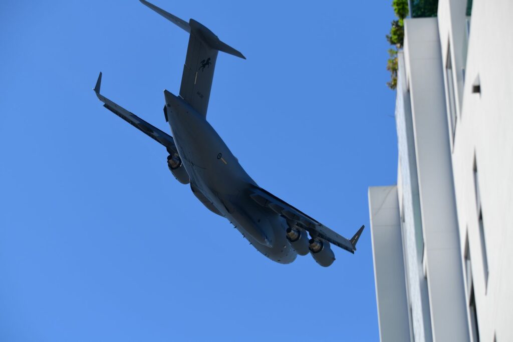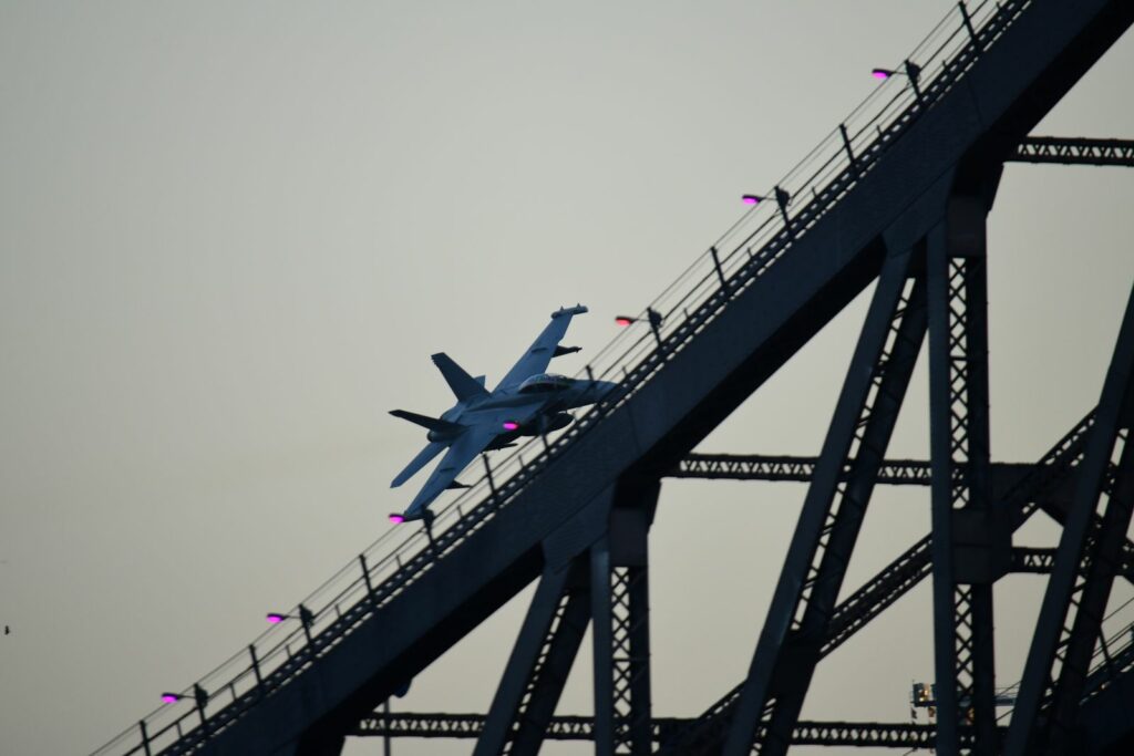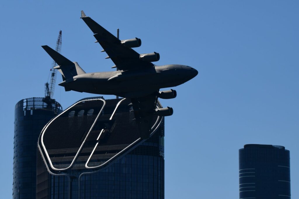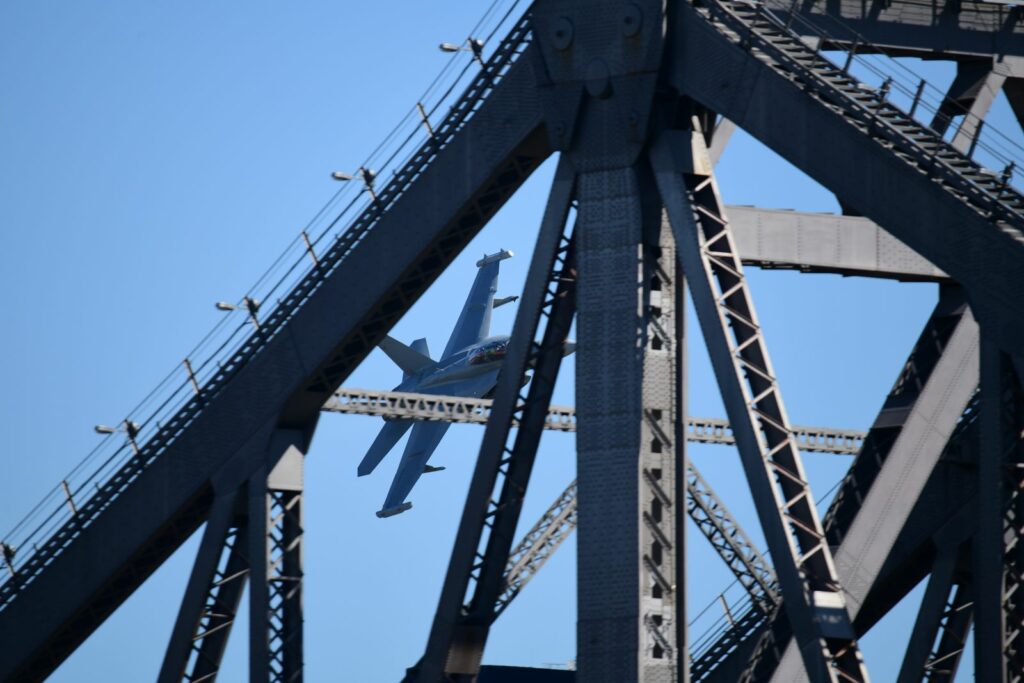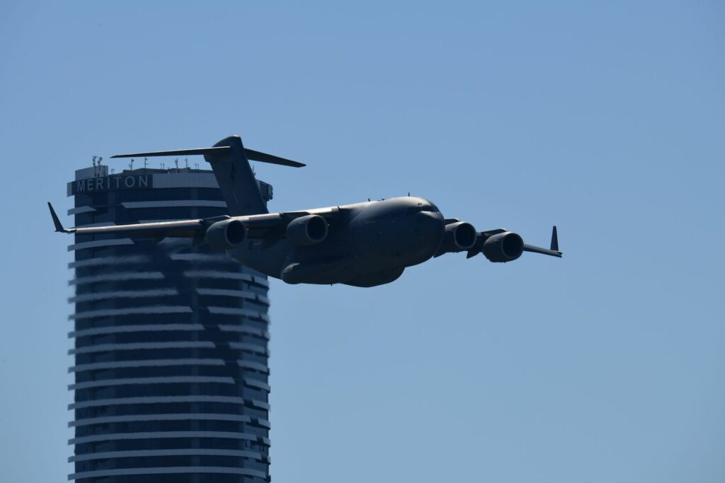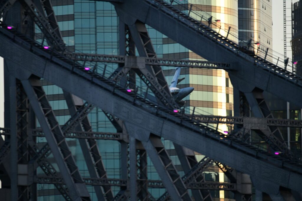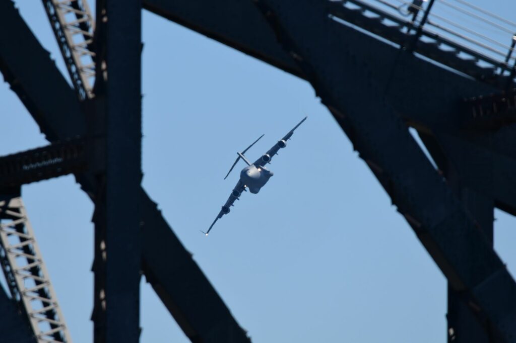 Entre les effets permis par le Story Bridge et les buildings, et malgré la taille imposante de l’appareil, le C17 montre une certaine souplesse à enchainer les figures à faible vitesse et faible hauteur. Les profilés du Story Bridge rappellent dans certains cas la partie de plaisir à capturer certains appareils à Louisville dans le Kentucky aux USA.