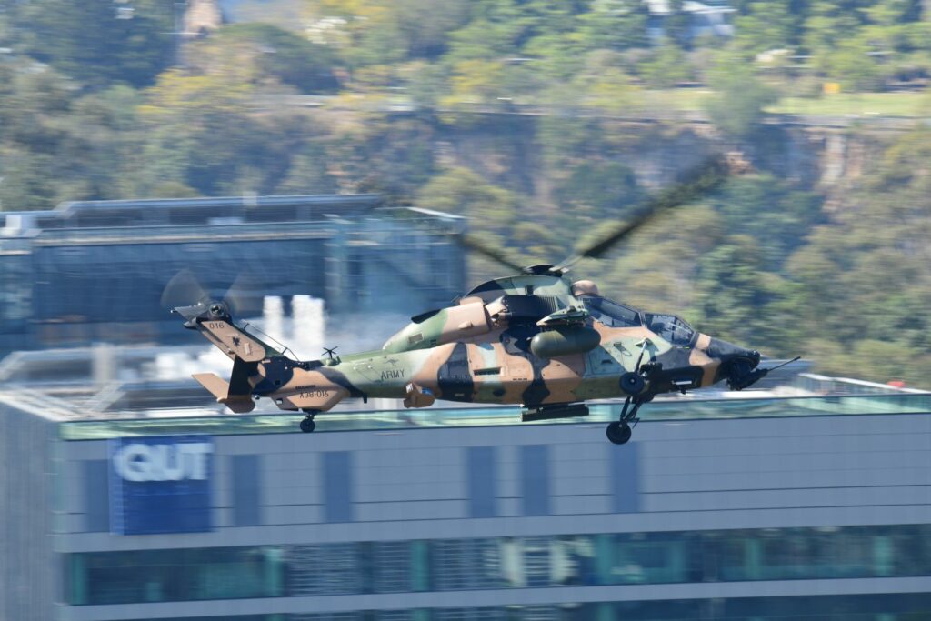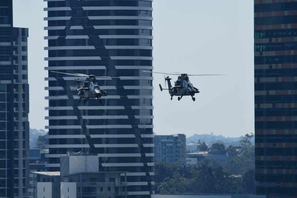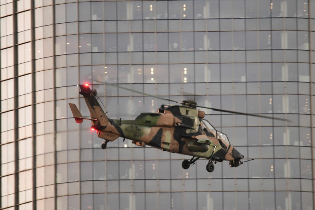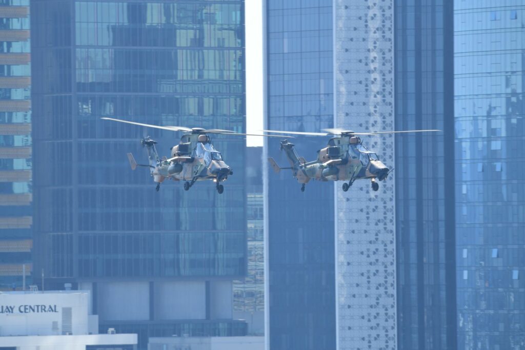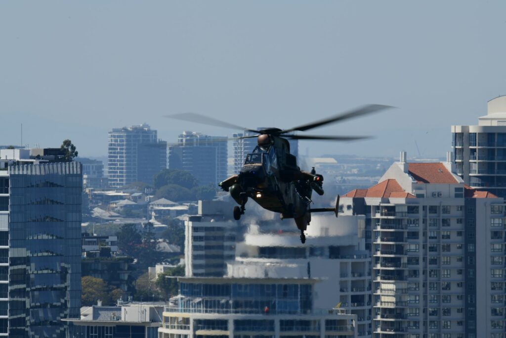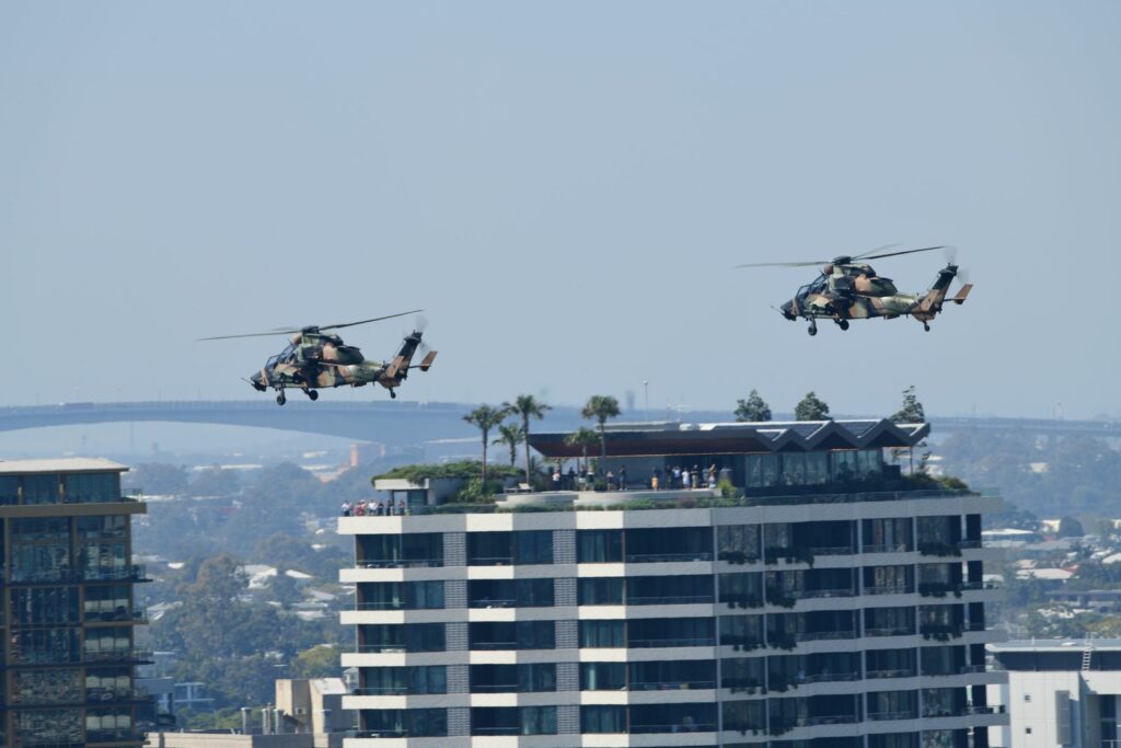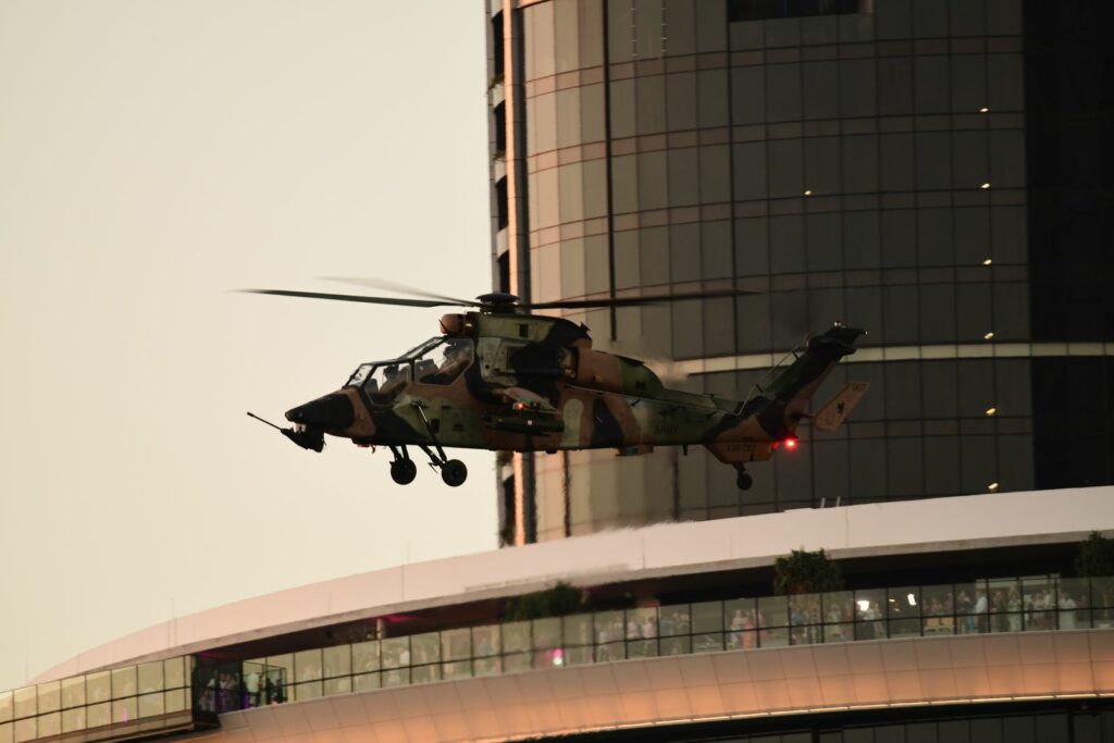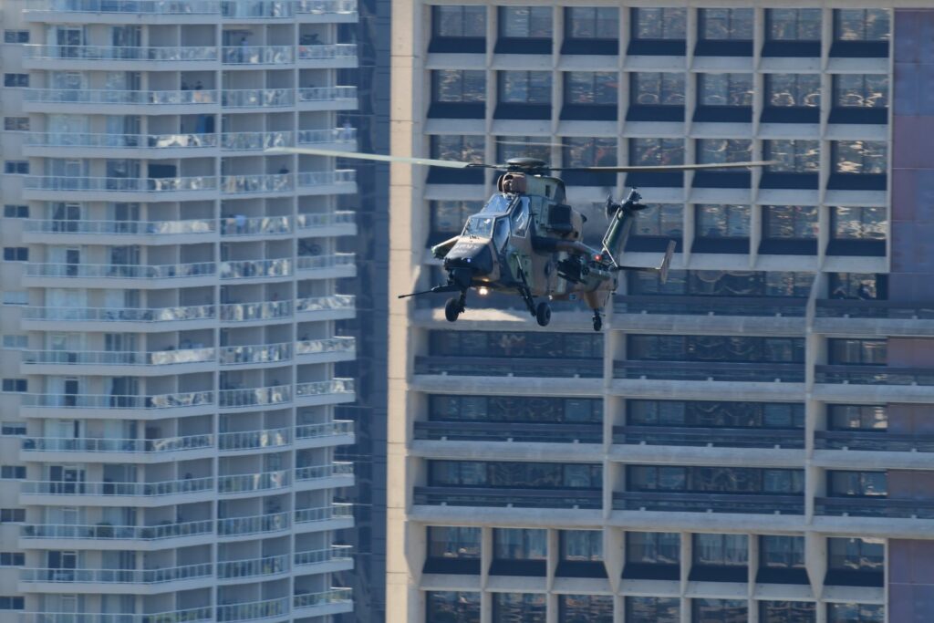 L’édition 2024 voit le retour de l’Eurocopter Tigre à Riverfire. Tout comme pour le C17, le point d’observation choisi est un rooftop à South Bank. Ce ne sont non pas un mais deux Tigres qui se présentent.