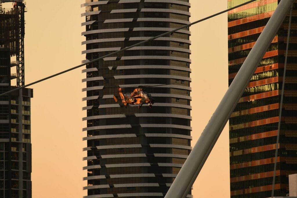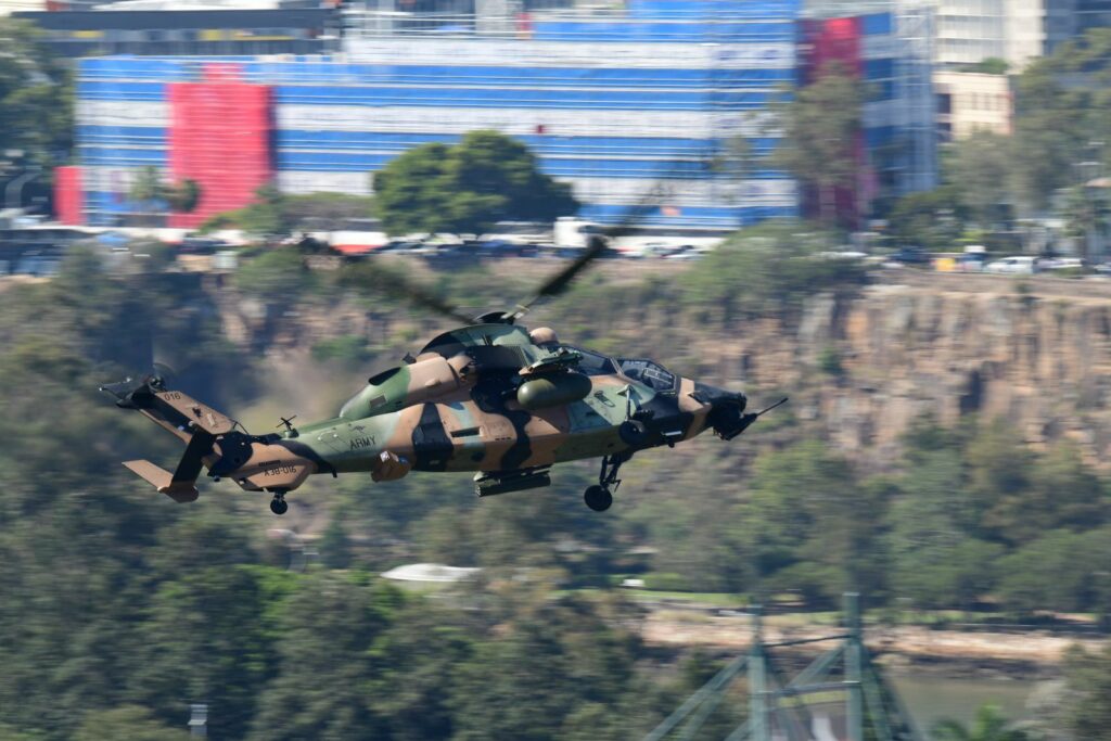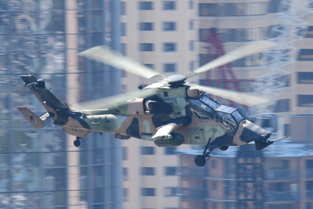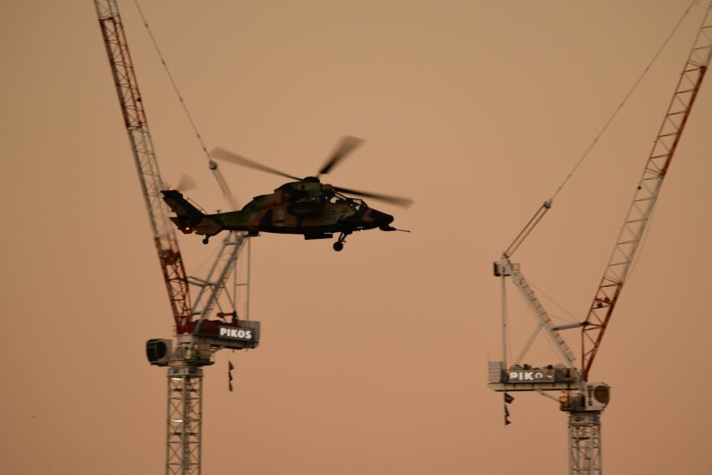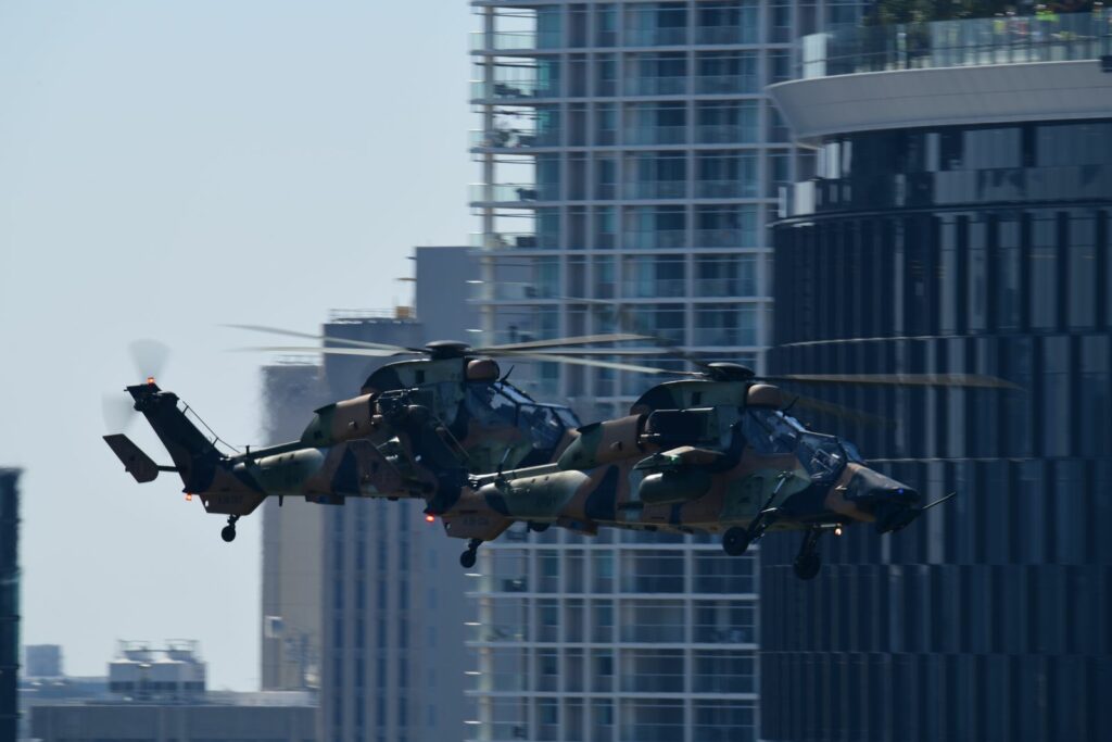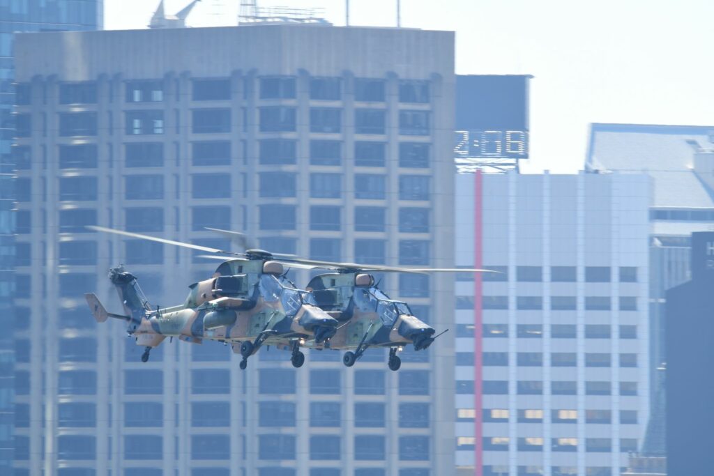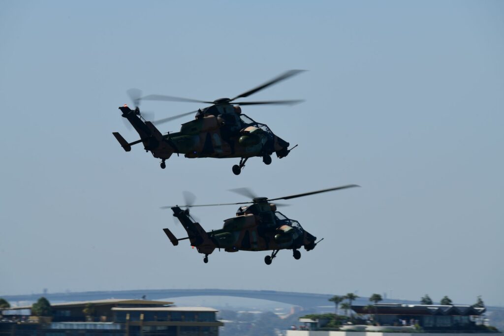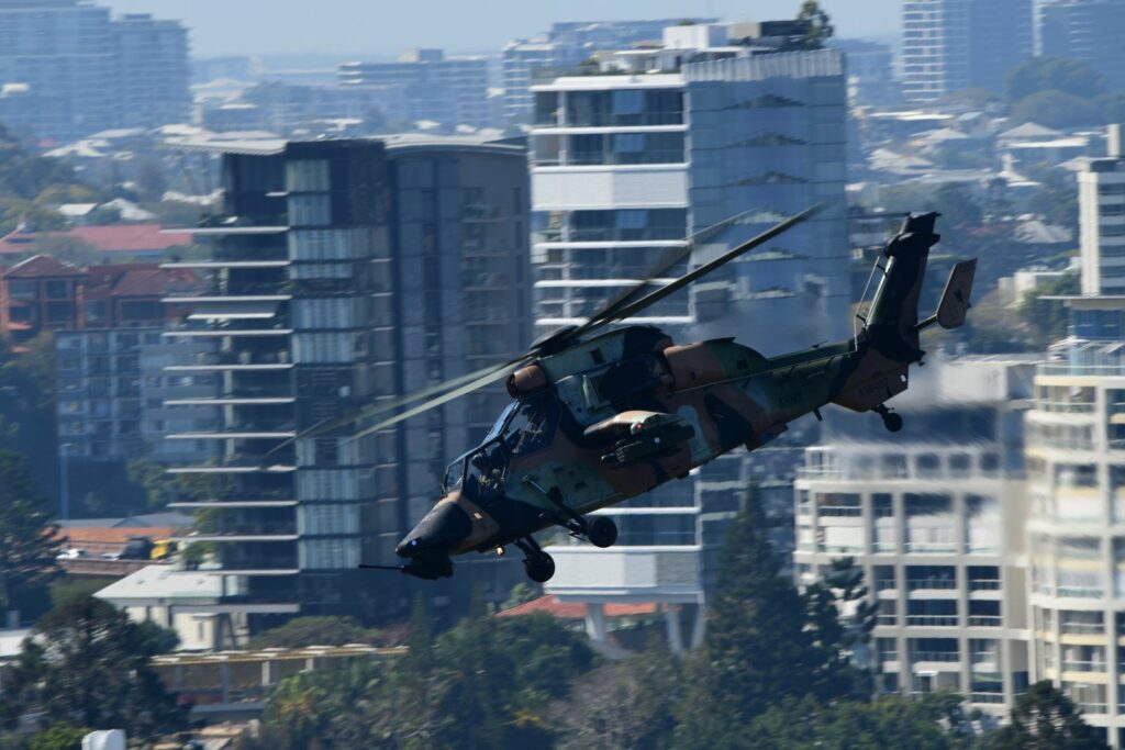 L’édition 2024 voit le retour de l’Eurocopter Tigre à Riverfire. Tout comme pour le C17, le point d’observation choisi est un rooftop à South Bank. Ce ne sont non pas un mais deux Tigres qui se présentent.