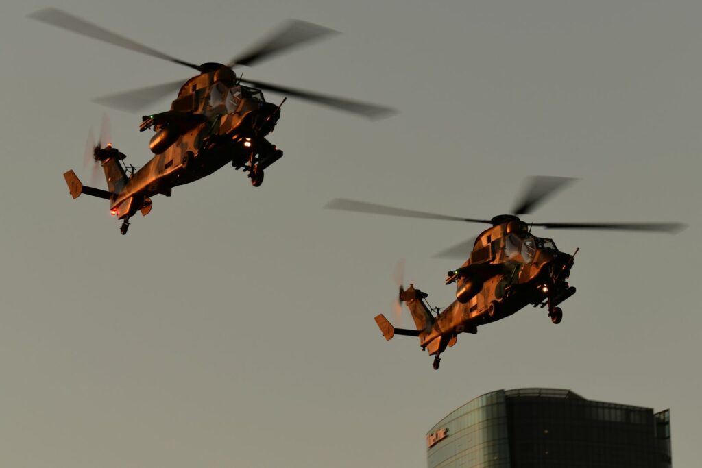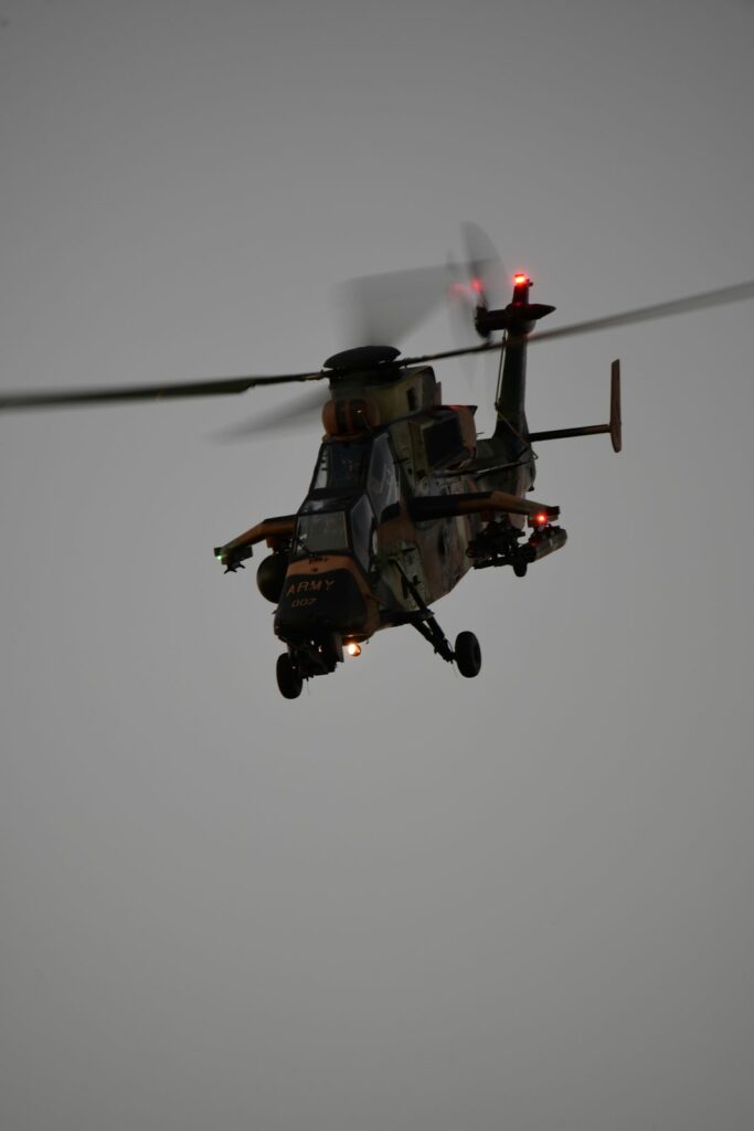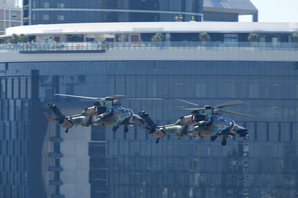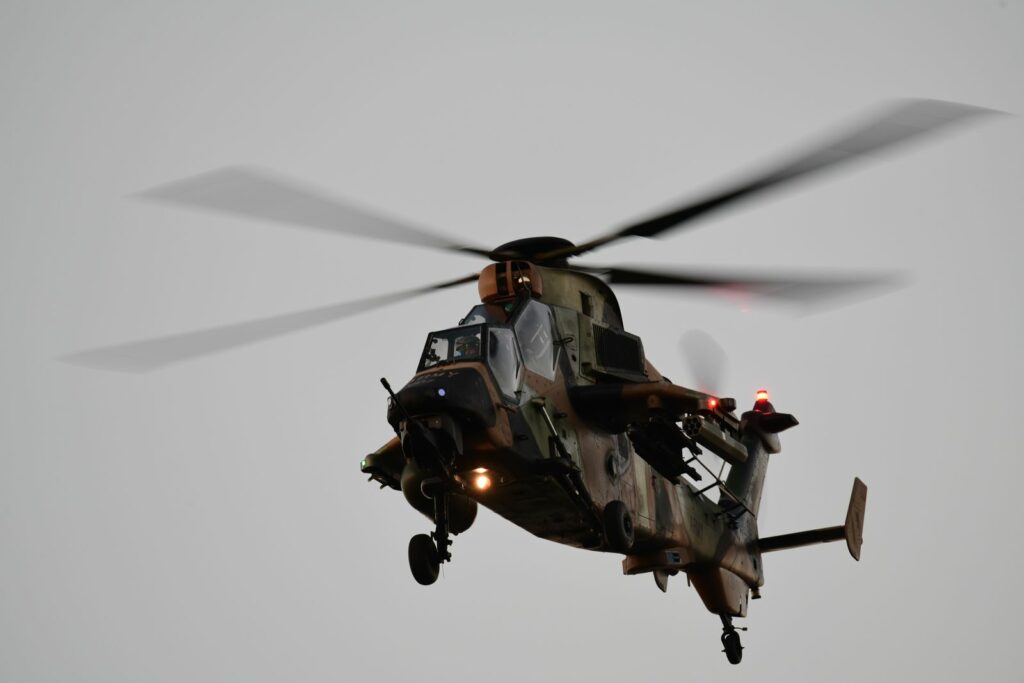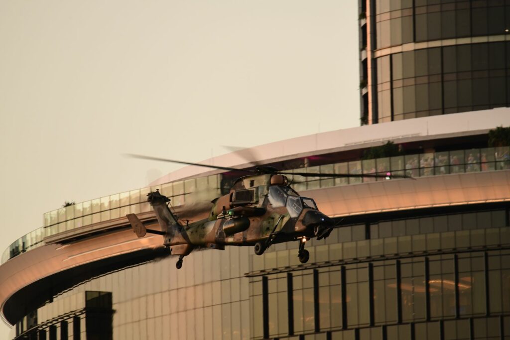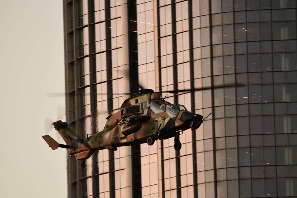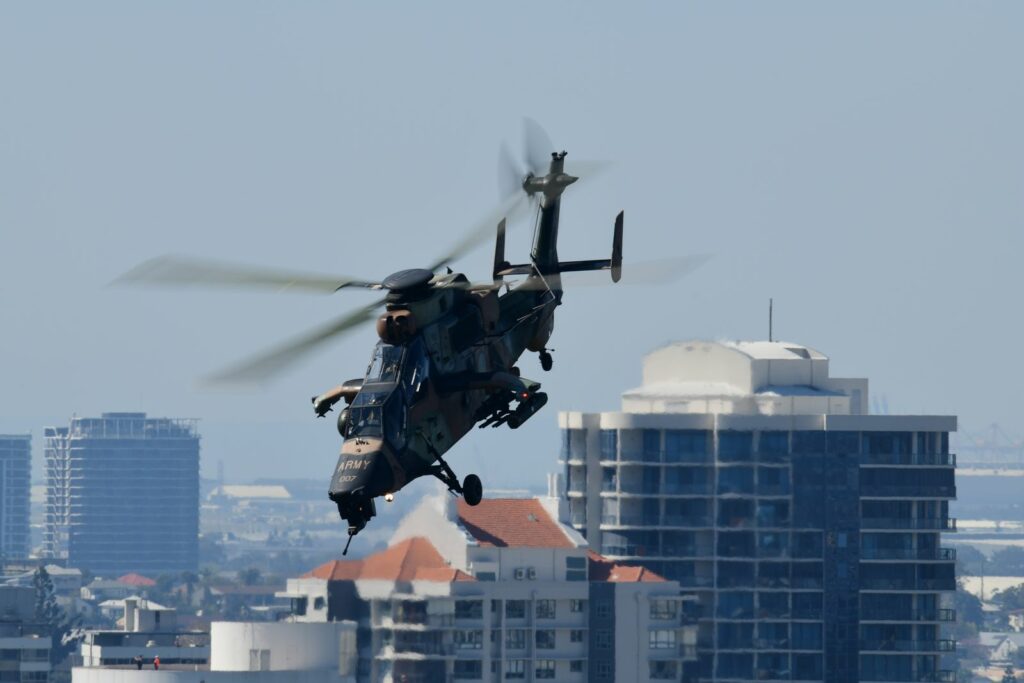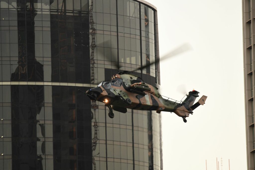 L’édition 2024 voit le retour de l’Eurocopter Tigre à Riverfire. Tout comme pour le C17, le point d’observation choisi est un rooftop à South Bank. Ce ne sont non pas un mais deux Tigres qui se présentent.