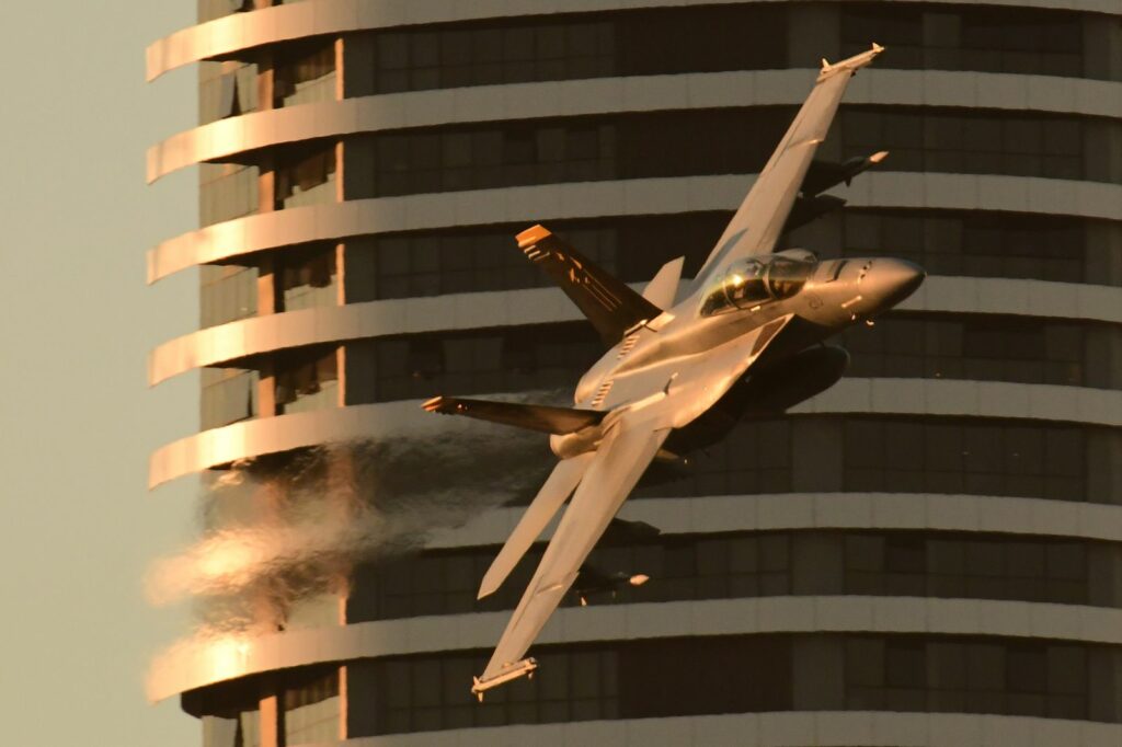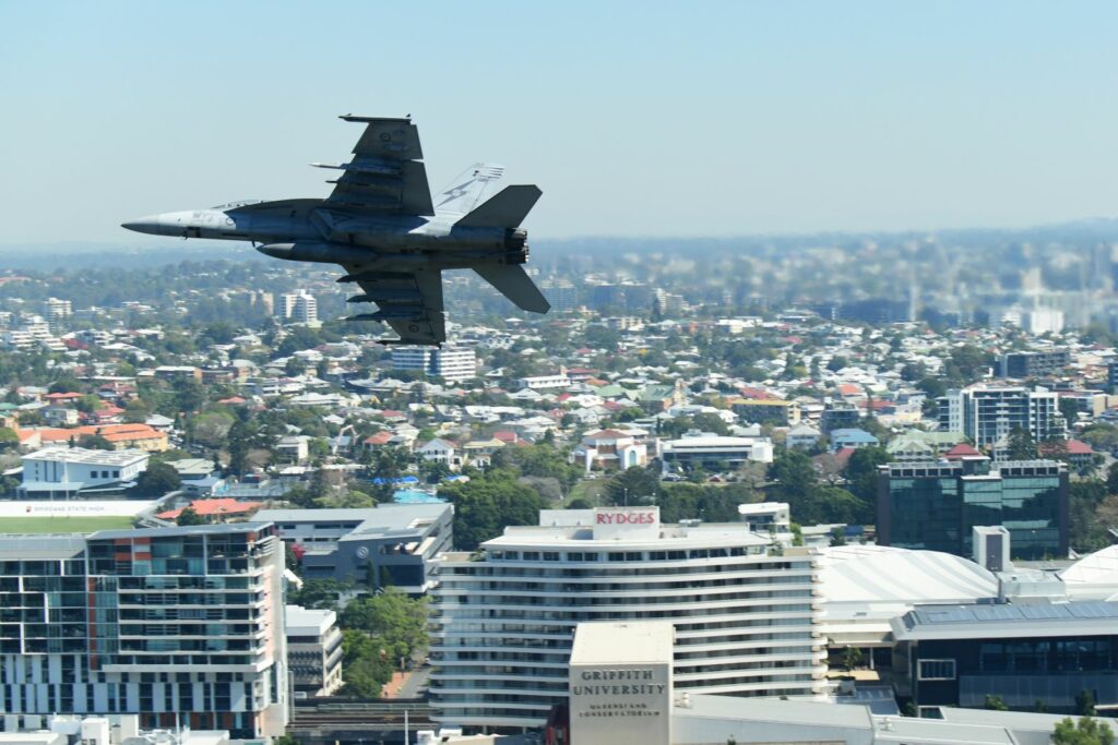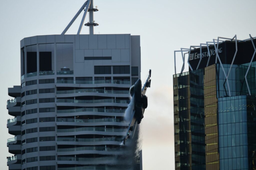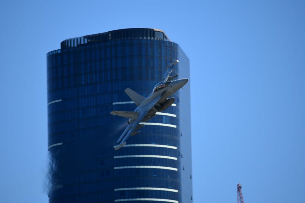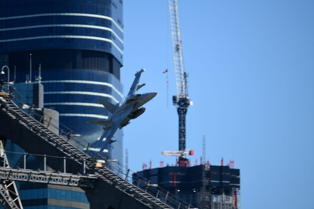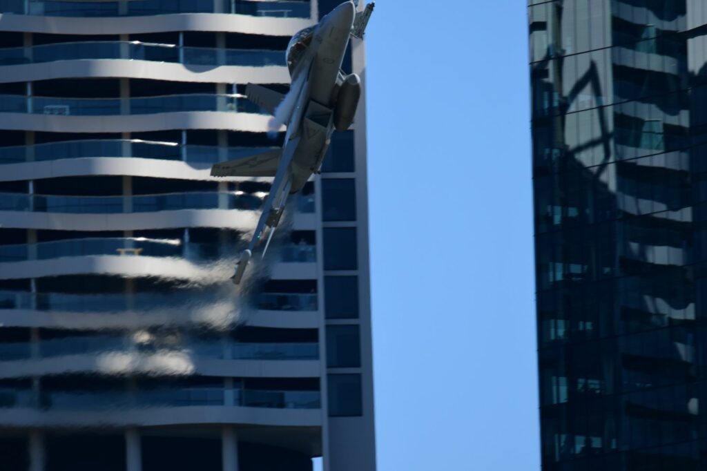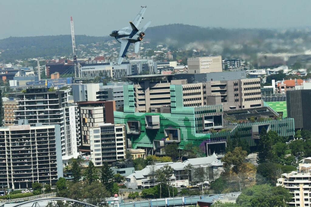 Le second temps, qui est en fait les vols de démonstration officiels, a lieu le samedi au moment du coucher du soleil, lorsque celui-ci est sur le point de quitter l’horizon. Cela rend la prise de photo délicate mais constitue un challenge incroyable. Cela offre deplus certaines couleurs dignes du panorama du premier Top Gun. Les images vaudront mieux que mille mots.Cet évènement est très populaire à Brisbane et regroupe les foules. Les meilleurs points de vue sont plébiscités tôt dans la journée. Il faut, soit réserver des mois à l’avance un rooftop (attention – les prix sont ajustés en conséquence), et faire preuve de patience une bonne partie du samedi (prévoir d’y aller en groupe pour alterner et se rafraichir), ou alors connaître un gestionnaire d’immeuble qui ouvrirait gentiment le toit d’une des tours – quasiment mission impossible, mais pas tant que ça non plus