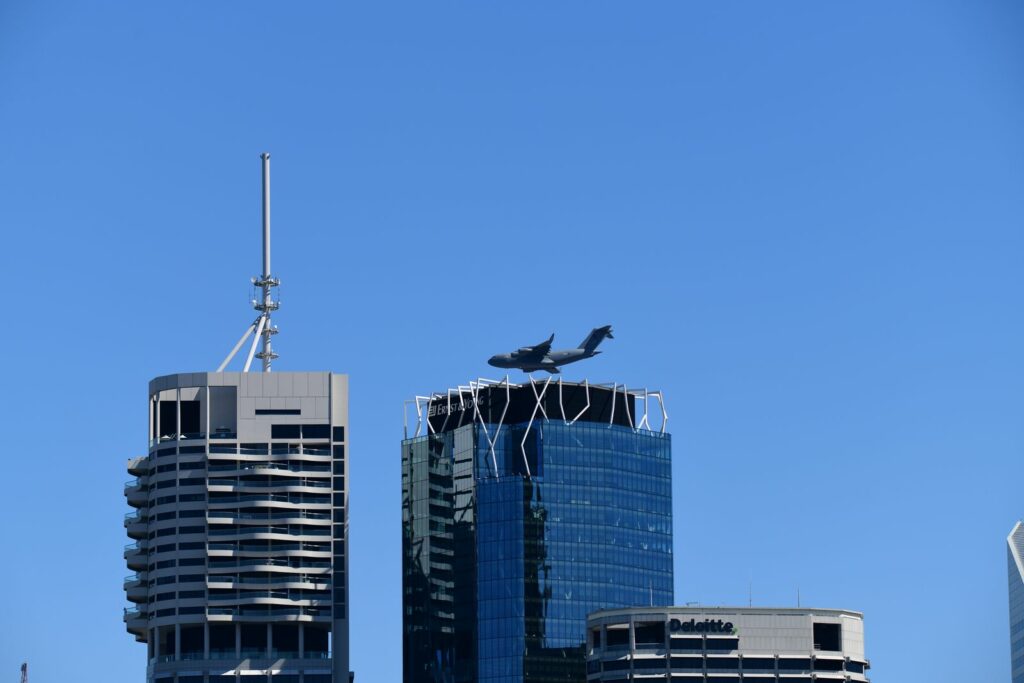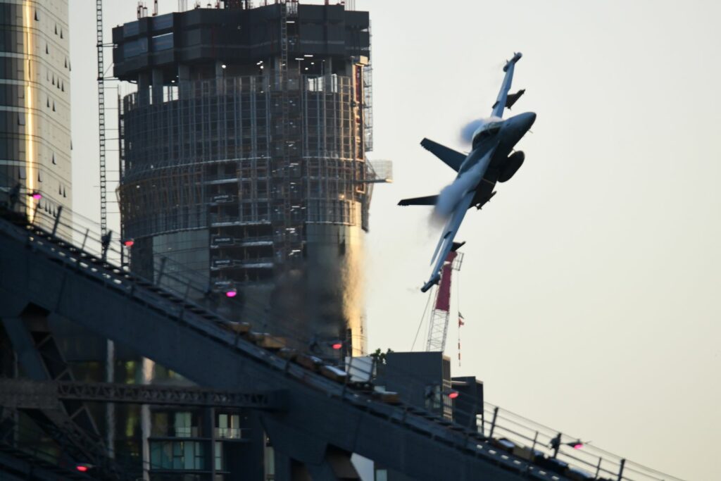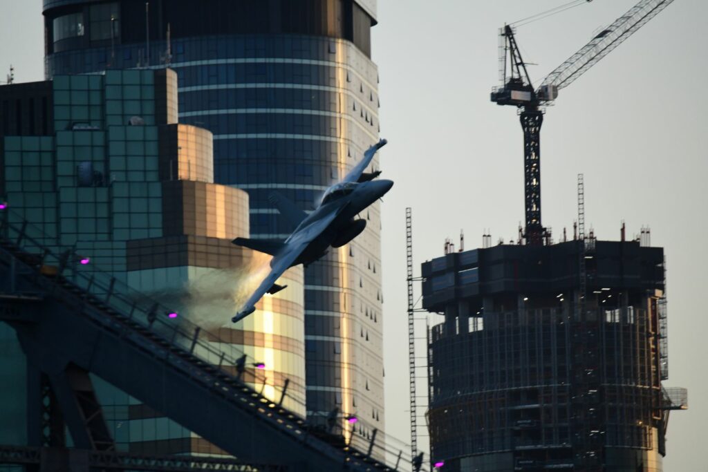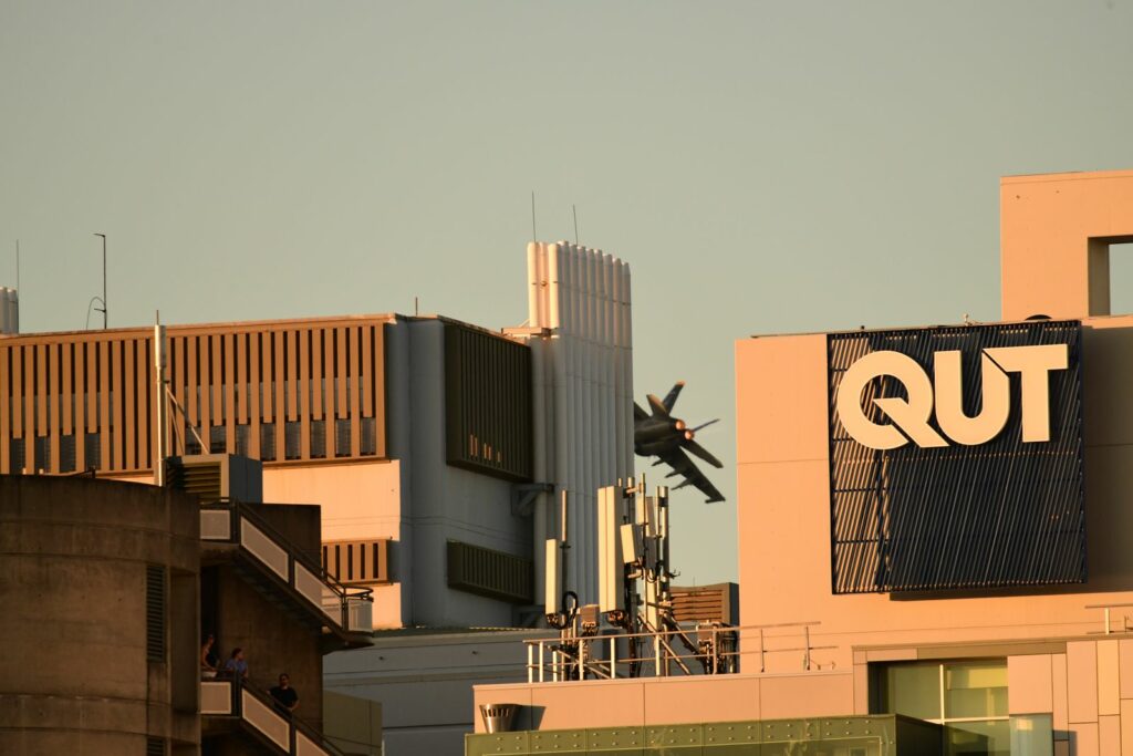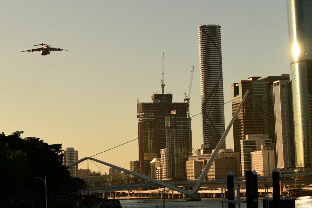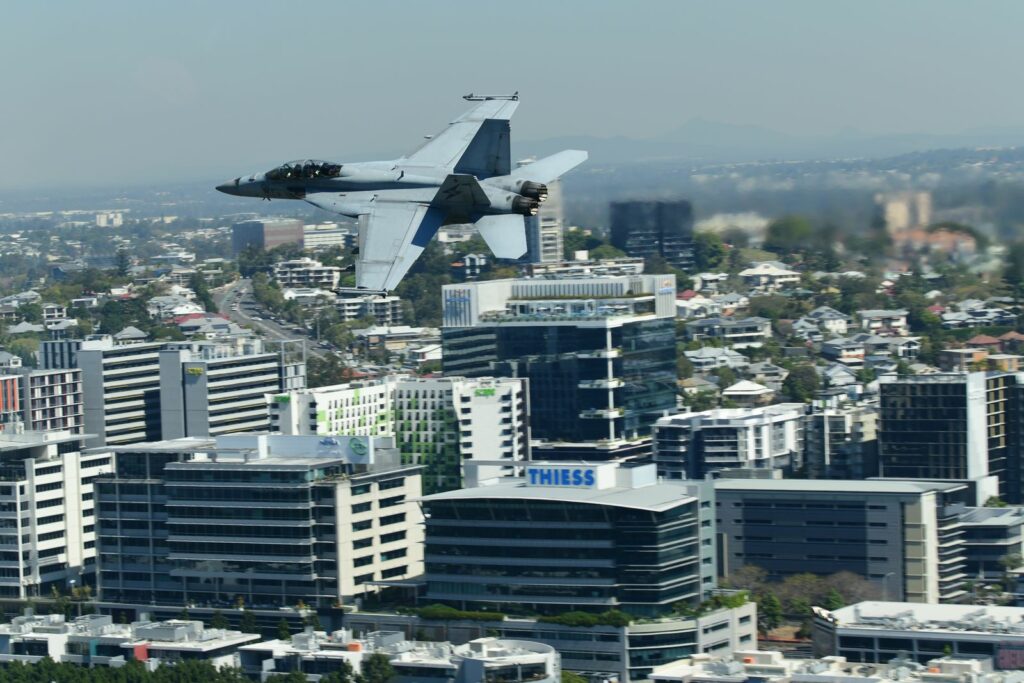 Le second temps, qui est en fait les vols de démonstration officiels, a lieu le samedi au moment du coucher du soleil, lorsque celui-ci est sur le point de quitter l’horizon. Cela rend la prise de photo délicate mais constitue un challenge incroyable. Cela offre deplus certaines couleurs dignes du panorama du premier Top Gun. Les images vaudront mieux que mille mots.Cet évènement est très populaire à Brisbane et regroupe les foules. Les meilleurs points de vue sont plébiscités tôt dans la journée. Il faut, soit réserver des mois à l’avance un rooftop (attention – les prix sont ajustés en conséquence), et faire preuve de patience une bonne partie du samedi (prévoir d’y aller en groupe pour alterner et se rafraichir), ou alors connaître un gestionnaire d’immeuble qui ouvrirait gentiment le toit d’une des tours – quasiment mission impossible, mais pas tant que ça non plus
