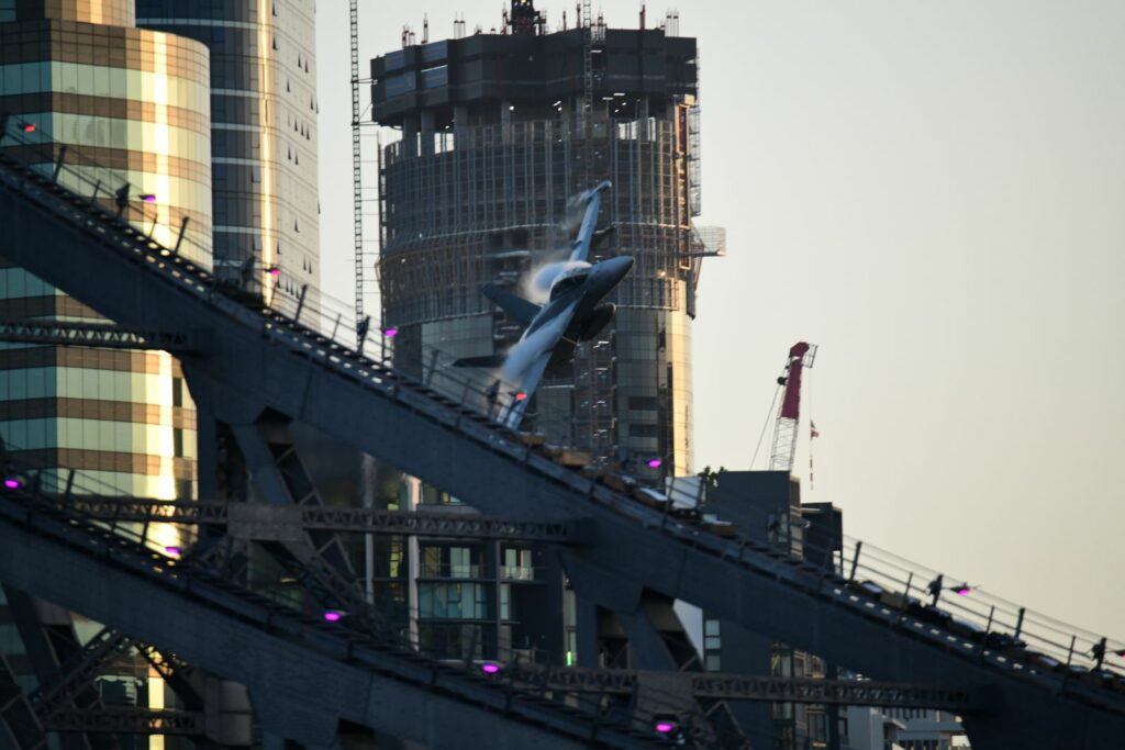 Il n’y a guère de mots pour traduire l’intensité des passages (il y a en fait deux Growlers qui effectuent l’entrainement) et la difficulté à traquer les chasseurs entre les tours et le Story Bridge.
